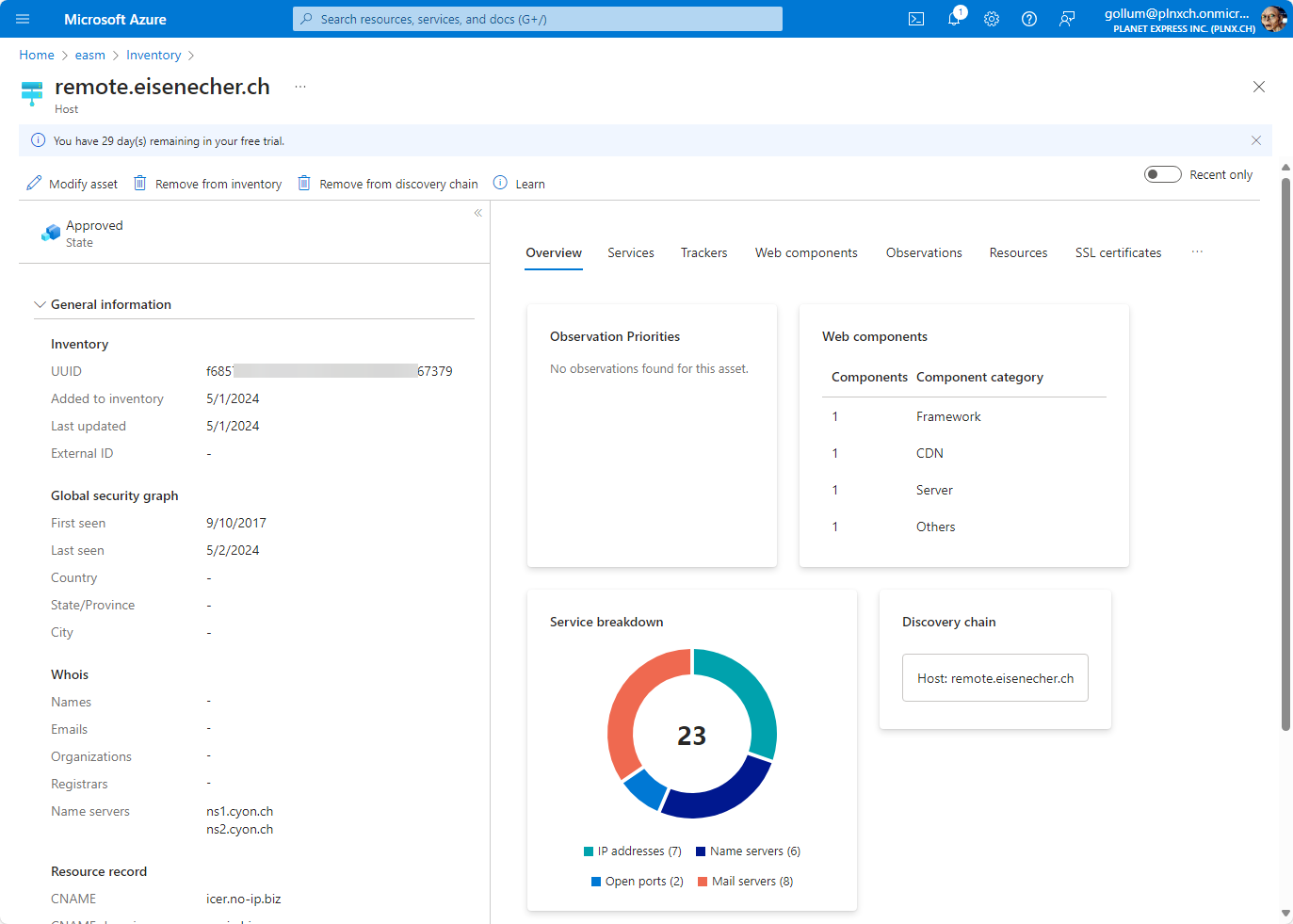 According to the documentation of Microsoft each approved asset (Domain, IP address, Host) will be billed for $0.011 per day. According to the overview shown before and without further tuning we have following billable assets: