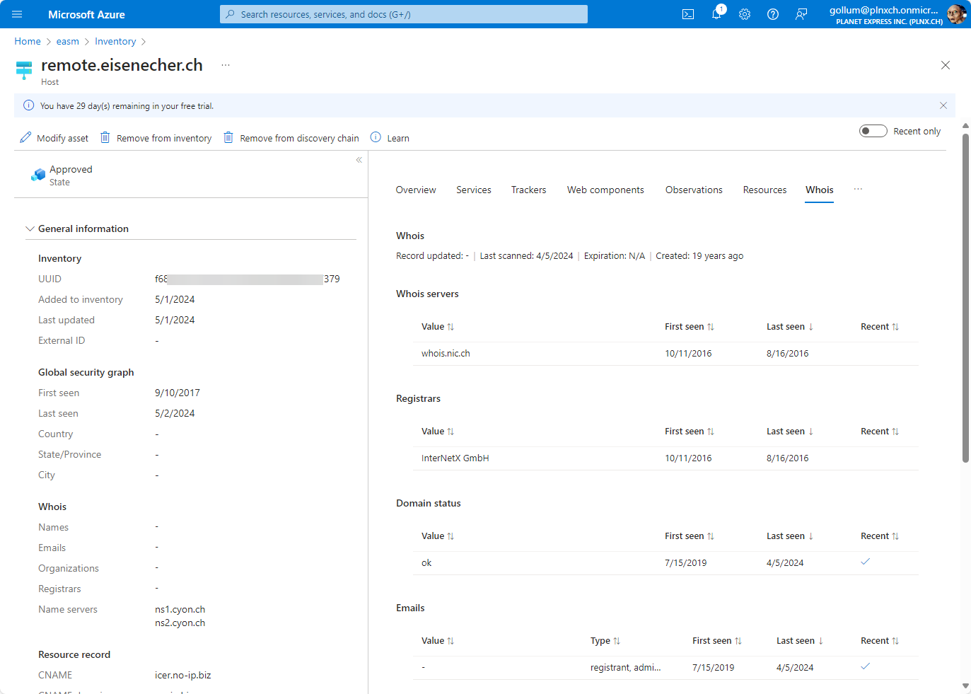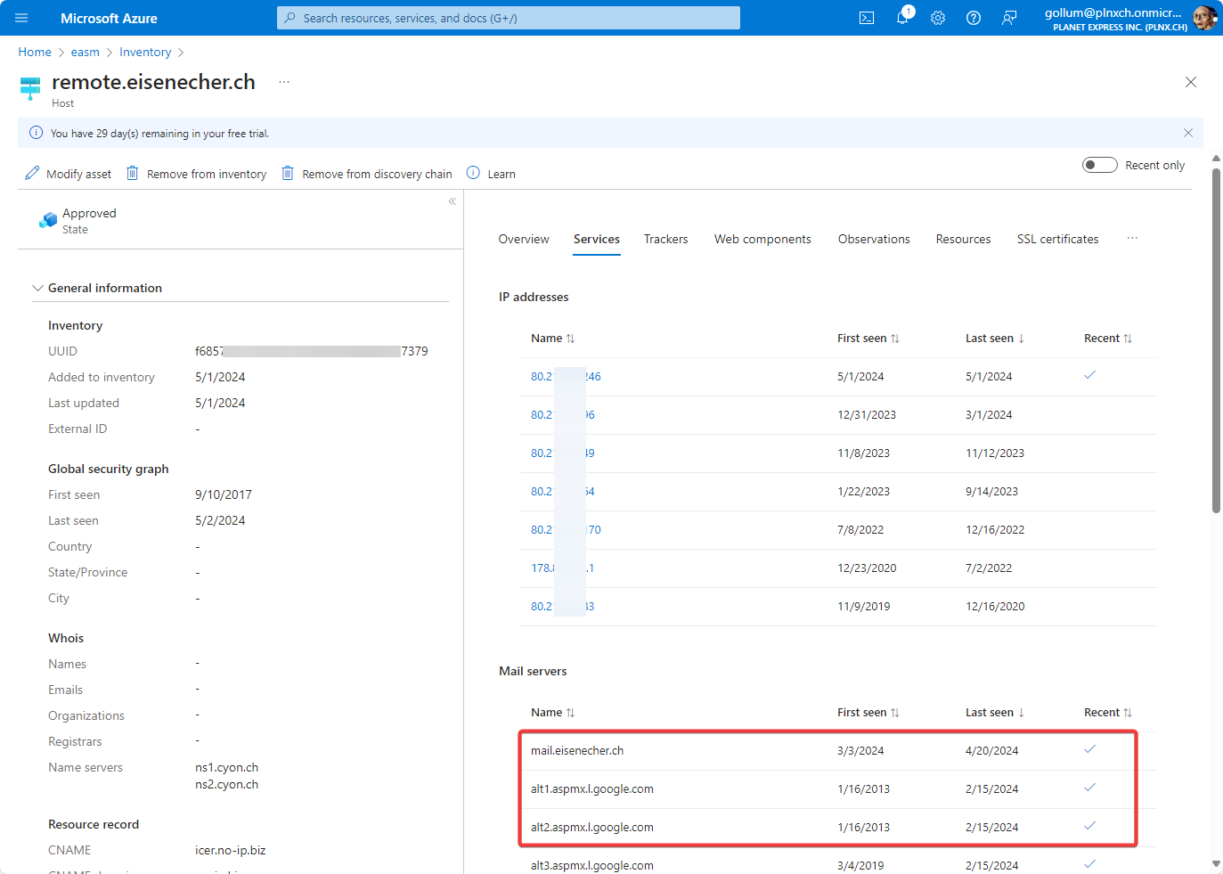 remote.eisenecher.ch) we initially specified in the discovery page, EASM found additional hosts which belong to your assets. Beside of the name you get additional information like IP address, corresponding DNS servers, when the name was first and last seen. If you click now on the host you get details about the host. Here are screenshots of the details EASM discovered:
